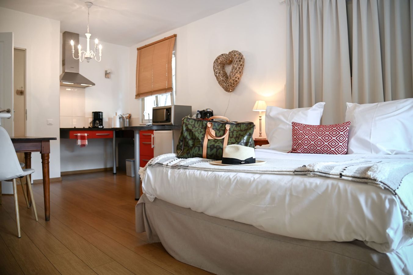 De couleur sable tantôt teintée de rouge, l’ambiance de la chambre est une ode à la romance. Nous avons préservé les anciens meubles de famille et axé la décoration sur le thème des cœurs.