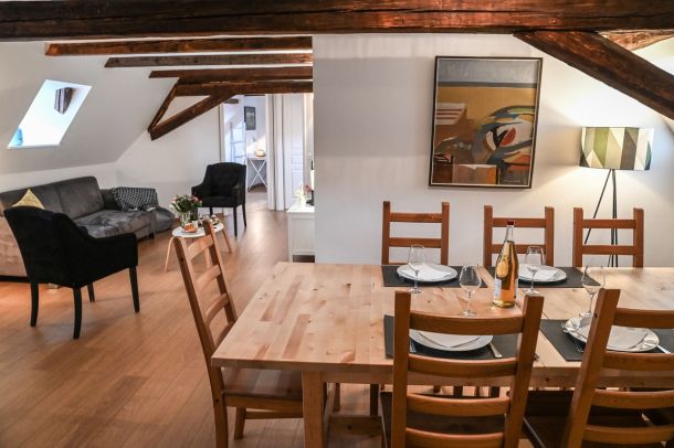 Nos 2 gîtes grand confort vous accueillent dans notre maison typique alsacienne. Situés aux 2e et 3e étages de la demeure, ils surplombent les toits de la cité fortifiée. Vous êtes aux premières loges pour observer le ballet gracieux des cigognes !